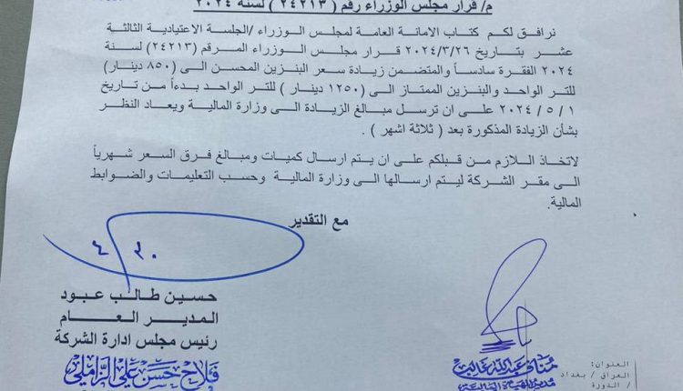 اعتبارا من 2024/5/1 رفع سعر البانزين المحسن من 650 دينار الى 850 دينار والبانزين الممتاز من 1000 دينار الى 1250 دينار