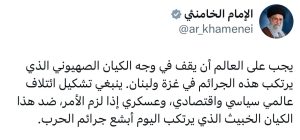 الإمام الخامنئي (دام ظله) يجب على العالم أن يقف في وجه الكيان الصهيوني الذي يرتكب هذه الجرائم في غزة ولبنان