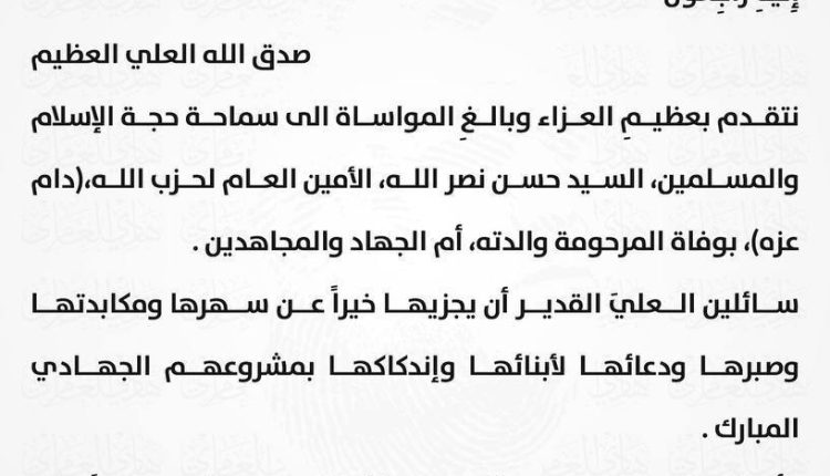 • الامين العام لمنظمة بدر الحاج هادي العامري يتقدم بالتعزية لسماحة السيد حسن نصرالله بوفاة والدته