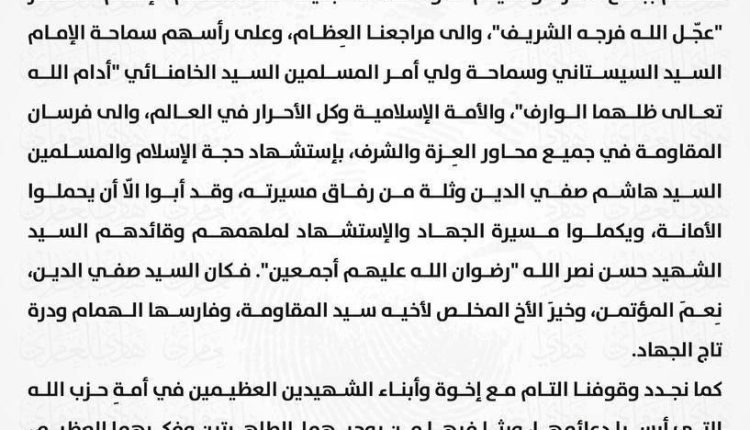 نتقدم ببالغ العزاء وعظيم المواساة الى بقية الله الأعظم، الإمام المنتظر “عجّل الله فرجه الشريف”، والى مراجعنا العِظام، وعلى رأسهم سماحة الإمام السيد السيستاني وسماحة ولي أمر المسلمين السيد الخامنائي “أدام الله تعالى ظلهما الوارف”، والأمة الإسلامية وكل الأحرار في العالم، والى فرسان المقاومة في جميع محاور العِزة والشرف، بإستشهاد حجة الإسلام والمسلمين السيد هاشم صفي الدين وثلة من رفاق مسيرته.