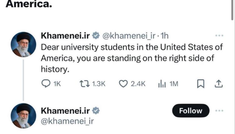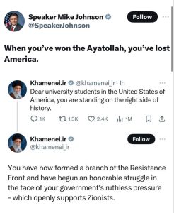 مايك جونسون رئيس مجلس النواب الأميركي ، يعيد نشر نص رسالة قائد الثورة ألإمام الخامنئي دام ظله إلى الطلاب الأميركيين وكتب: “إذا أرضيتم آية الله فقد خسرتم أميركا”.