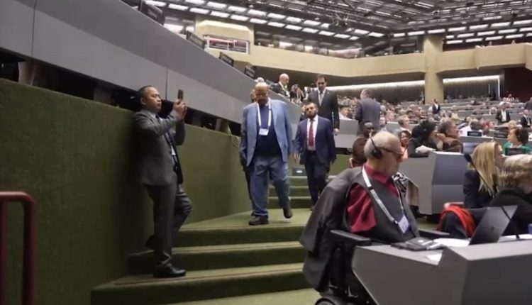 الوفد النيابي العراقي برئاسة المندلاوي ينسحب من قاعة مؤتمر اجتماعات رؤساء البرلمانات الدولي في دورته ال 149 المنعقد في جنيف مع بدء كلمة وفد الكيان الصهيوني