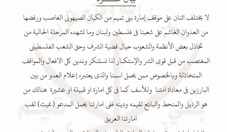 بالوثيقة بسبب دعمه للكيان الصـهـيوني بيان براءة امارة بني تميم من المدعو (غيث عبد الجبار عبد الله) المعروف بغيث التميمي ودعوة للحكومة العراقية لملاحقته قانونياً.