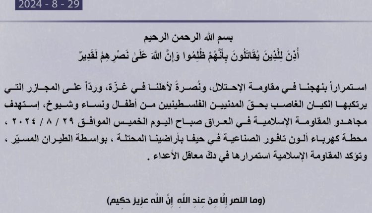 استمراراً بنهجنا في مقاومة الإحتلال، ونُصرةً لأهلنا في غزّة، وردّاً على المجازر التي يرتكبها الكيان الغاصب بحقّ المدنيين الفلسطينيين من أطفال ونساء وشيوخ، إستهدف مجاهدو المقاومة الإسلامية في العراق صباح اليوم الخميس الموافق 29 / 8 / 2024 ، محطة كهرباء ألون تافور الصناعية في حيفا بأراضينا المحتلة ، بواسطة الطيران المسيّر ، وتؤكد المقاومة الإسلامية استمرارها في دكّ معاقل الأعداء .