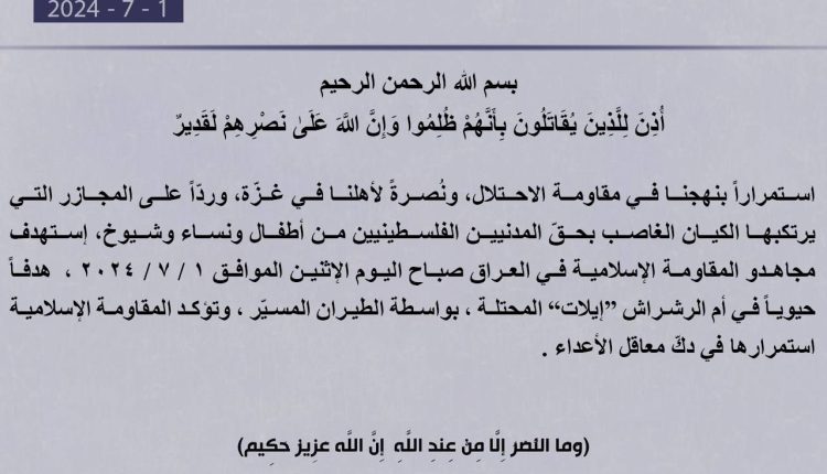 استمراراً بنهجنا في مقاومة الاحتلال، ونُصرةً لأهلنا في غزّة، وردّاً على المجازر التي يرتكبها الكيان الغاصب بحقّ المدنيين الفلسطينيين من أطفال ونساء وشيوخ، إستهدف مجاهدو المقاومة الإسلامية في العراق صباح اليوم الإثنين الموافق 1 / 7 / 2024 ،  هدفاً حيوياً في أم الرشراش “إيلات” المحتلة ، بواسطة الطيران المسيّر ، وتؤكد المقاومة الإسلامية استمرارها في دكّ معاقل الأعداء .