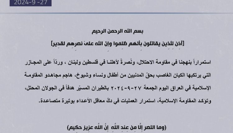 استمراراً بنهجنا في مقاومة الاحتلال، ونُصرةً لأهلنا في فلسطين ولبنان ، وردّاً على المجازر التي يرتكبها الكيان الغاصب بحقّ المدنيين من أطفال ونساء وشيوخ، هاجم مجاهدو المقاومة الإسلامية في العراق اليوم الجمعة 27-9-2024 بالطيران المسيّر هدفاً في الجولان المحتل، وتؤكد المقاومة الإسلامية، استمرار العمليات في دكّ معاقل الأعداء بوتيرة متصاعدة.