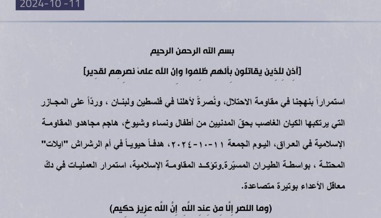 استمراراً بنهجنا في مقاومة الاحتلال، ونُصرةً لأهلنا في فلسطين ولبنان ، وردّاً على المجازر التي يرتكبها الكيان الغاصب بحقّ المدنيين من أطفال ونساء وشيوخ، هاجم مجاهدو المقاومة الإسلامية في العراق، اليوم الجمعة 11-10-2024، هدفاً حيوياً في أم الرشراش “ايلات” المحتلة ، بواسطة الطيران المسيّرة.