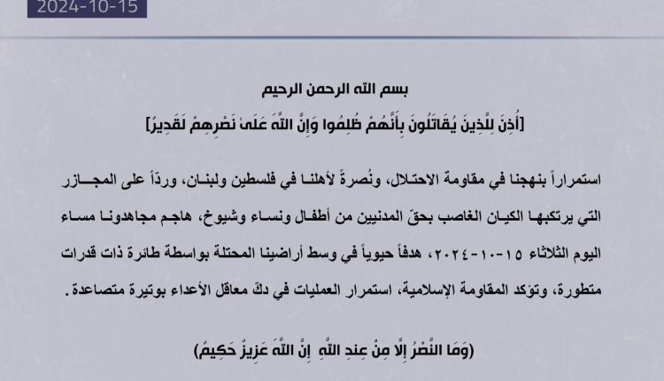 استمراراً بنهجنا في مقاومة الاحتلال، ونُصرةً لأهلنا في فلسطين ولبنان، وردّاً على المجازر التي يرتكبها الكيان الغاصب بحقّ المدنيين من أطفال ونساء وشيوخ، هاجم مجاهدونا مساء اليوم الثلاثاء 15-10-2024، هدفاً حيوياً في وسط أراضينا المحتلة بواسطة طائرة ذات قدرات متطورة، وتؤكد المقاومة الإسلامية، استمرار العمليات في دكّ معاقل الأعداء بوتيرة متصاعدة.