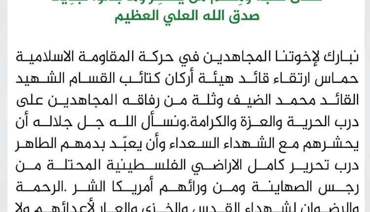 نبارك لإخوتنا المجاهدين في حركة المقاومة الاسلامية حماس ارتقاء قائد هيئة أركان كتائب القسام الشهيد القائد محمد الضيف وثلة من رفاقه المجاهدين على درب الحرية والعزة والكرامة.
