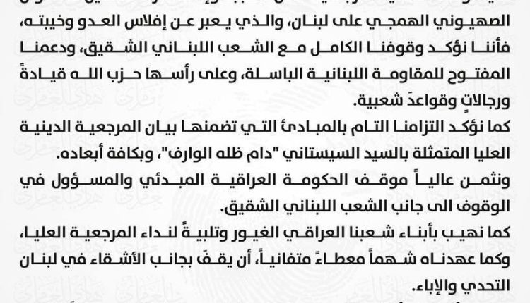في الوقت الذي نعرب فيه عن شجبنا وإستنكارنا التامين للعدوان الصهيوني الهمجي على لبنان، والذي يعبر عن إفلاس العدو وخيبته، فأننا نؤكد وقوفنا الكامل مع الشعب اللبناني الشقيق، ودعمنا المفتوح للمقاومة اللبنانية الباسلة، وعلى رأسها حزب الله قيادةً ورجالاتٍ وقواعدَ شعبية.