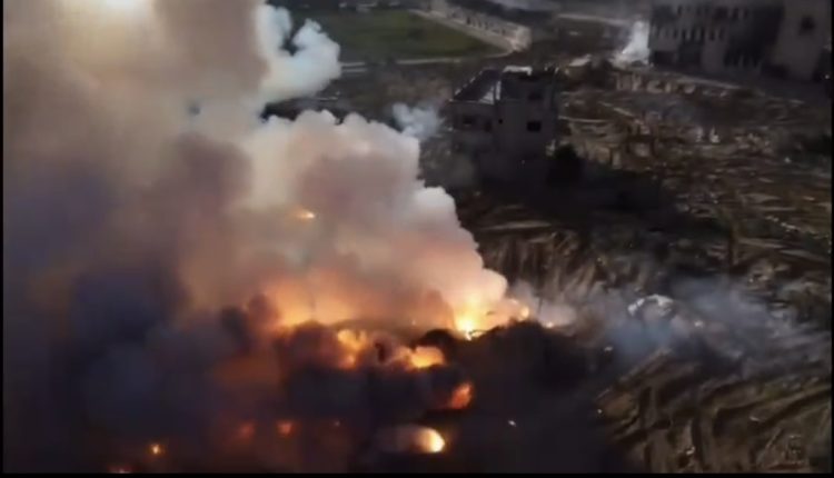 جندي صهيوني يستعرض استخدام الفسفور الأبيض المحرم دولياً في أحد الأحياء الفلسطينية في المدينة خانيونس