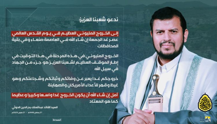ندعو شعبنا العزيز إلى الخروج المليوني العظيم في يوم القدس العالمي عصر غد الجمعة إن شاء الله في العاصمة صنعاء وفي بقية المحافظات
