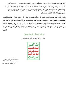 – ينبغي للمسلمين جميعا أن يتذكروا ما تتعرض له القضية الفلسطينية عموماً من مؤامرات أمريكية إسرائيلية لتصفيتها، ومسؤوليتهم تجاه ذلك