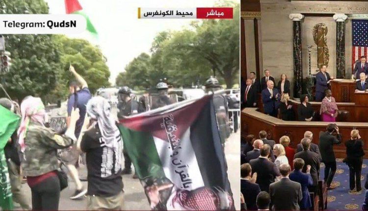 متظاهرون يرفعون راية حركة حماس وصورة أبو عبيدة، ويهتفون ضد نتنياهو قرب الكونغرس الأمريكي، تزامناً مع بدء كلمة نتنياهو