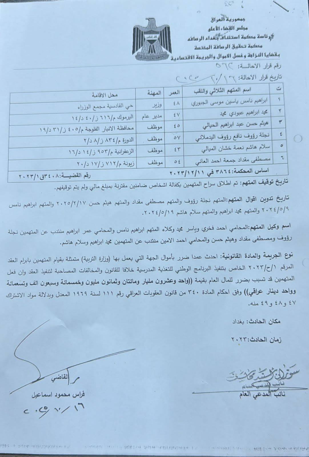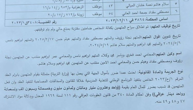 محكمة النزاهة تحيل وزير التربية إبراهيم النامس الجبوري إلى محكمة الجنايات لمحاكمته بتهمة إلحاق ضرر متعمد بأموال الدولة يتجاوز 21 مليار دينار.