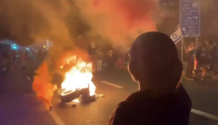 مستوطنون صهاينة غاضبون يشعلون النيران خلال تظاهرة تطالب بإبرام صفقة تبادل أسرى مع المقاومة الفلسطينية