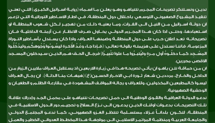 منظمة بدر تدعو الدولة العراقية والقوى الوطنية إلى حمل تصريحات المجرم “نتنياهو” على محمل الجد وإدراك علاقة تلك التصريحات بدعوات أولئك الذين يدعون إلى نزع سلاح المقاومة وتحجيم دور الدول الإسلامية في المنطقة.