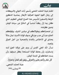تتقدم هيئة الحشد الشعبي بأسمى آيات التهاني والتبريكات إلى رجال القوة الجوية العراقية الأبطال بمناسبة الذكرى الرابعة والتسعين لتأسيس هذا الصرح الوطني العظيم، الذي كان وما زال ركناً أساسياً في الدفاع عن سيادة الوطن وصون كرامته.