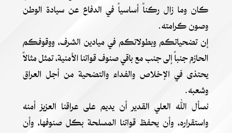 إن تضحياتكم وبطولاتكم في ميادين الشرف، ووقوفكم الحازم جنباً إلى جنب مع باقي صنوف قواتنا الأمنية، تمثل مثالاً يحتذى في الإخلاص والفداء والتضحية من أجل العراق وشعبه.