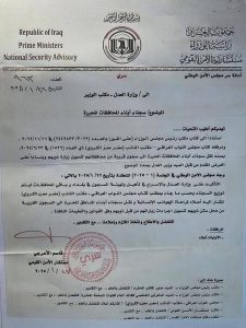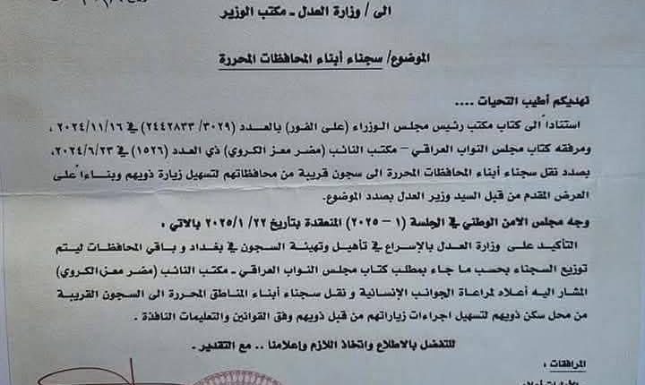 وثيقة سرية تتضمن توجيهًا من السوداني لمستشاره للأمن القومي، قاسم الأعرجي، بنقل السجناء الإرهابيين الذين ينحدرون من المناطق الغربية من سجون (الجنوب) إلى مناطق قريبة من سكنهم وأهلهم في (الغربية).