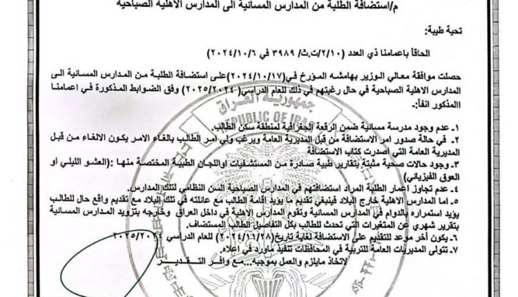 • وزارة التربية تسمح بإستضافة طلبة المدارس المسائية الى الاهلية الصباحية