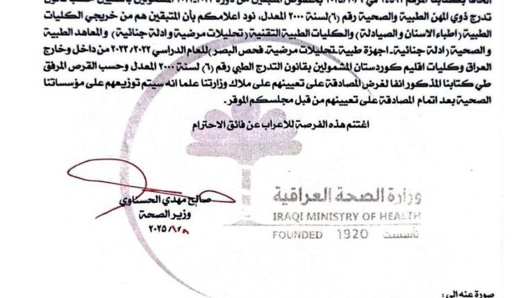 وزارة الصحة تخاطب مجلس الخدمة العامة لتعيين خريجي الكليات والمعاهد الطبية والتقنية المشمولين بقانون تدرج ذوي المهن الطبية والصحية رقم 6 لسنة 2000 المعدل المتبقين من دورة 2022-2023