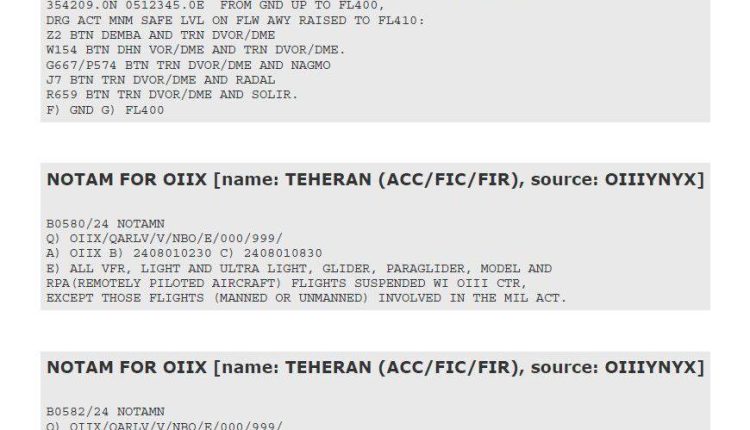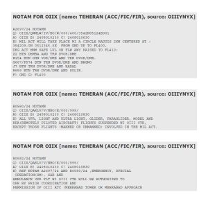 إشعارات NOTAM الصادرة عن إيران بتاريخ 1 أغسطس 2024. سيتم تعليق الرحلات الجوية فوق طهران من الساعة 0230 إلى الساعة 0830 بالتوقيت العالمي، بسبب النشاط العسكري في دائرة نصف قطرها كيلومترين حول 35°42’09.0″N 051°23’45.0″E، وتمتد من مستوى الأرض إلى 40.000 قدم