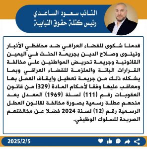 رئيس كتلة حقوق النيابية النائب سعود الساعدي قدمنا شكوى للقضاء العراقي ضد محافظي الأنبار ونينوى وصلاح الدين بجريمة الحنث في اليمين