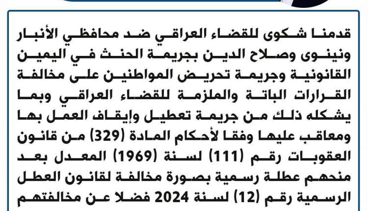 قدمنا شكوى للقضاء العراقي ضد محافظي الأنبار ونينوى وصلاح الدين بجريمة الحنث في اليمين القانونية وجريمة تحريض المواطنين على مخالفة القرارات الباتة والملزمة للقضاء العراقي