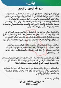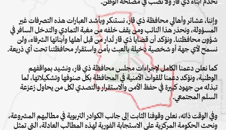وإننا، عشائر وأهالي محافظة ذي قار، نستنكر وبأشد العبارات هذه التصرفات غير المسؤولة، ونحذر هذا النائب ومن يقف خلفه من مغبة التمادي والتدخل السافر في شؤون محافظتنا. ونؤكد أن قضايا ذي قار تُدار من قبل أهلها وأبنائها الشرفاء، ولن نسمح لأي جهة أو شخصية دخيلة بالعبث بأمن واستقرار محافظتنا تحت أي ذريعة.